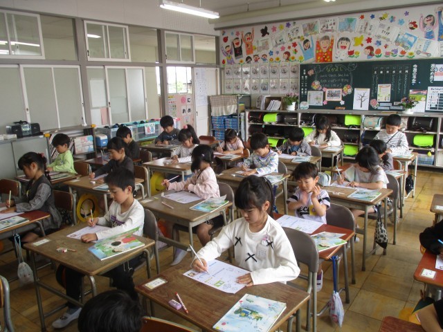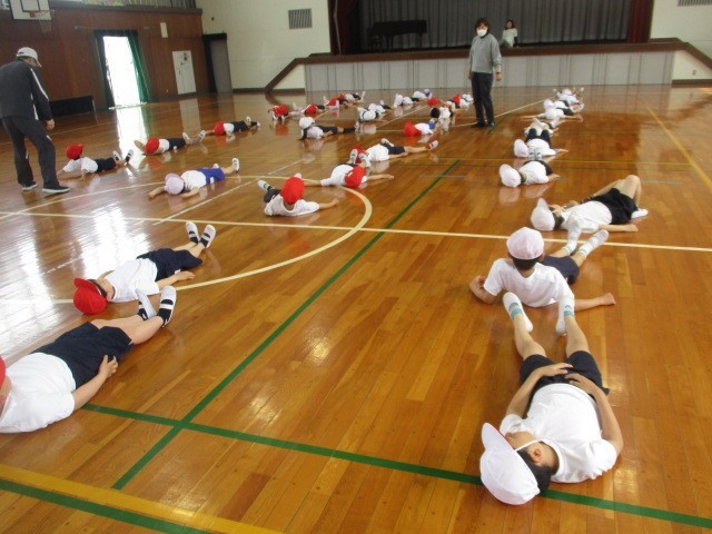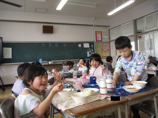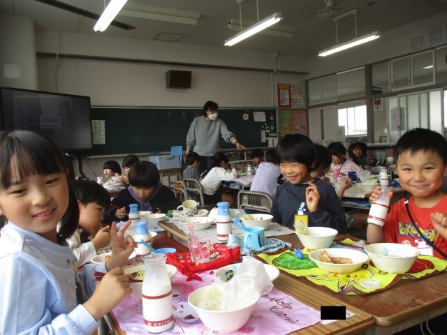 体育では、跳んだり跳ねたりして楽しく体を動かしました。国語はひらがなの練習です。姿勢を正しくして書きました。今日の給食は「しょうゆラーメン」です。ニコニコ笑顔で会食でしました。