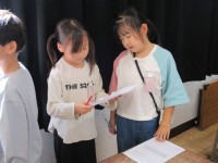 次に、いろいろな色の英語を学習しました。先生の言われる色を身の回りから探しました。洋服、文房具、ランドセルと身の回りにあるたくさんの色を楽しんで探していました。