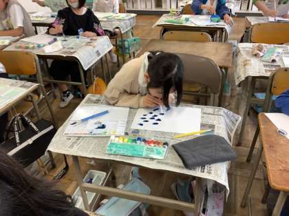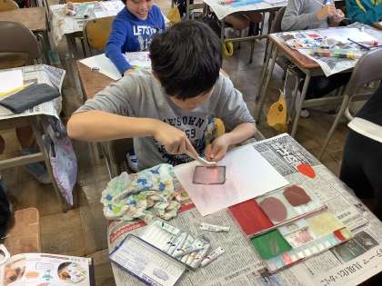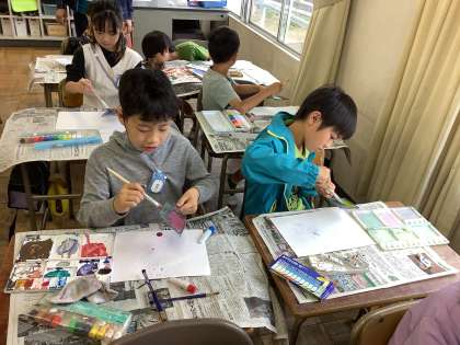 本日の図工で「絵の具でゆめもよう」を行いました。いくつかの技法を用いて、思い思いの模様を描きました。