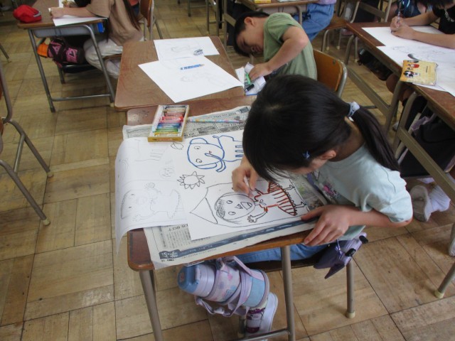「モリスくんと オレンジいろのドレス」という絵本を担任が読みました。子どもたちは、絵を見ないでお話の内容を想像しながら聞きました。その後、各々が、印象に残った場面を絵で表現しました。登場人物の思いや背景にこだわり、物語の世界に入り込んで描きました。子どもたちの印象に残った場面がそれぞれ違い、色々な場面が溢れていました。