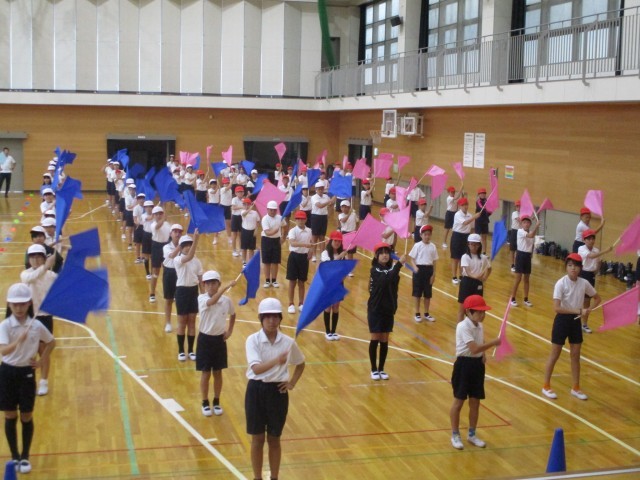 本日から運動会練習が始まりました。5年生と6年生は大きなフラッグを使った表現運動にチャレンジします。音がそろうと本当にかっこいいです。動きも難しく、全身運動なので非常に疲れますが、だれもあきらめることなく練習に取り組む様子が見られました。今後、どんどん成長していくと思います。本番がとても楽しみです。