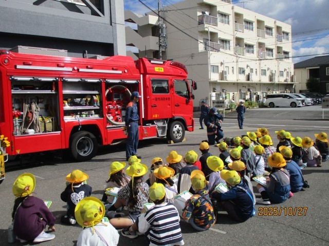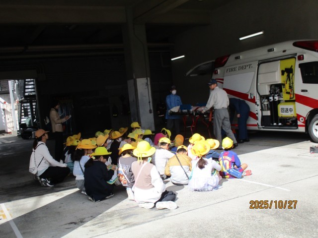 消防署見学に行ってきました。普段は見られない救助訓練や庁舎の中を見学をさせていただいたり、消防車や救急車についての説明を聞いたりしました。子どもたちは、目をいっぱい開いて、興味をもって消防署の人の話を聞いていました。消防隊員になりたいと思った子もいるようです。見学を通して、私たちの安心・安全なくらしが、いろいろな人たちの努力で支えられていることに気づいてくれたことと思います。