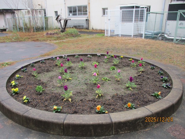 今日も、空は雨模様です。冬休みの「のびのび広場」は、ひっそりと静まり返っていますが、パンジーやストックなどのこれから春に向けて咲き続ける花たちが、お留守番をしています。植物たちも春に向けて、花やつぼみをつけてがんばっています。