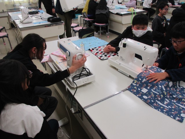 5年生の家庭科では、ミシンを使ってランチョンマットを作っています。