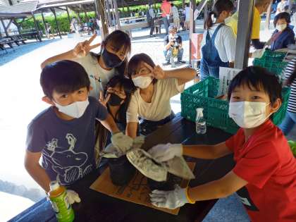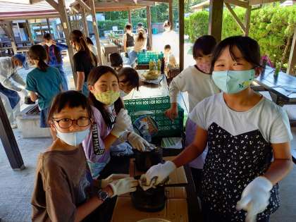 炊き上がりました!飯ごうの底を新聞紙でこすって、ご飯を取れやすくしています。あと、少しで完成です。
