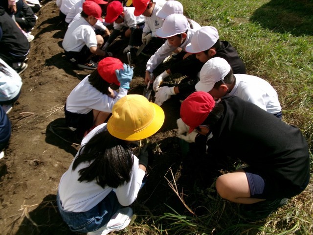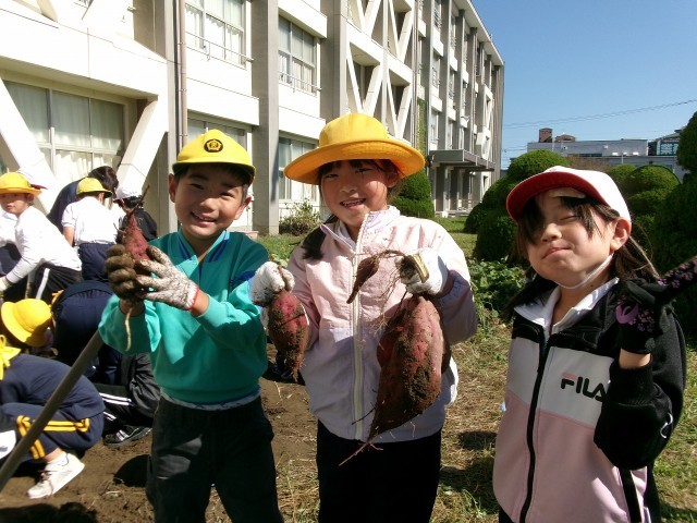 5月に植えた苗が大きく育ち、サツマイモ堀りをしました。サツマイモの中には、ラグビーボールぐらいの大きさのサツマイモがあり、驚いていまた。サツマイモ堀りから、秋を感じることができました。