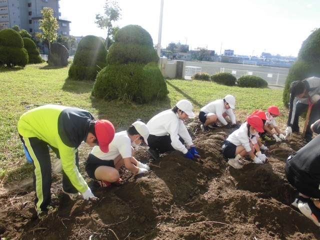 今日はあすなろ学級でいもほりをしました。土の中から大きないもが見えたときは、みんなが嬉しそうな顔をしていました。協力して、たくさんのいもを収穫することができました。