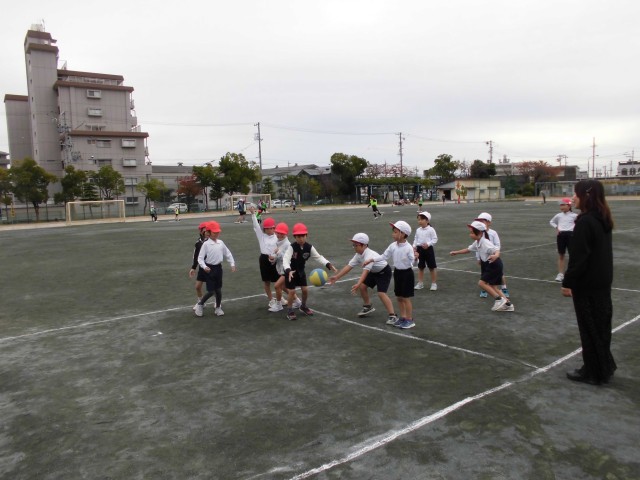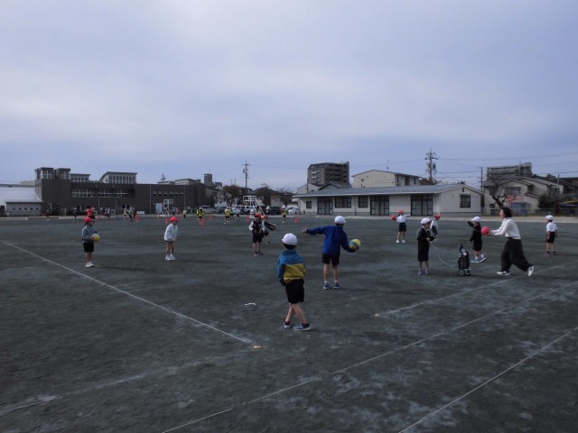 体育では、ボールを使ってキャッチボールをしたり、ゲームをしたりしています。キャッチボールが何回も続くように、相手の取りやすい力加減で投げることができました。ドッチボールでは、どの子も一生懸命にボールを追いかけ、投げることができました。