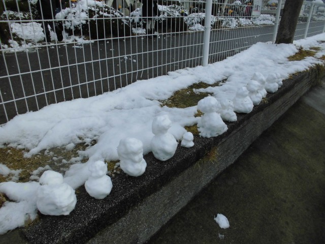生活科の勉強で雪遊びをしました。かわいい雪だるまが校舎前に沢山並んでいました。