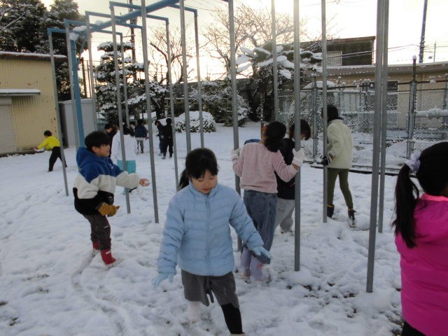 先週の雪が積もった日に、生活科の学習で「冬見つけ」をしました。「雪を踏むと音が出るよ」「鉄棒につららがあるよ」など楽しそうに発見をしていました。