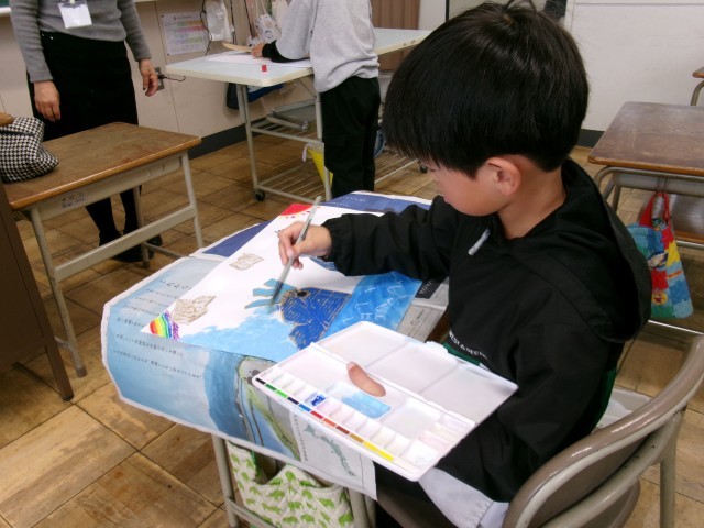 段ボールをビリビリやぶいて、生まれた形から想像しました。「犬に見える~。」「一宮市の形だよ。」見えた形からクレヨンで絵を付けたしました。カラフルに絵具で色をつけて。素敵な作品が出来上がりました。