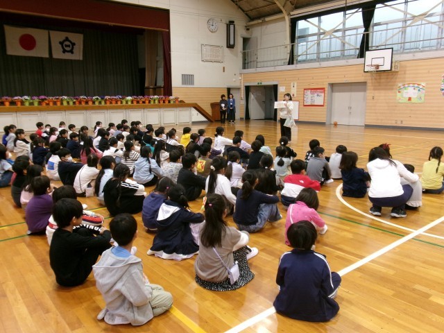 3年生の学年目標は「キラキラ」です。みなさんが元気に輝くような毎日が過ごせるように願いをこめました。初めての学年集会では、先生たちの紹介を聞きました。サッカーボールでリフティングを見せてもらったり、ロープワークを見せてもらったりしました。好きな野球選手の話。好きな食べ物の話など、しっかり聞く姿に、一つ学年が上がったんだなと感じられました。