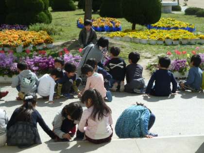 昇降口を出たところには、たくさんのきれいな花が咲いています。1年生のあるクラスでは、青空のもと、きれいな花をバックに一人一人すてきな笑顔で写真を撮っていました。