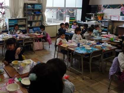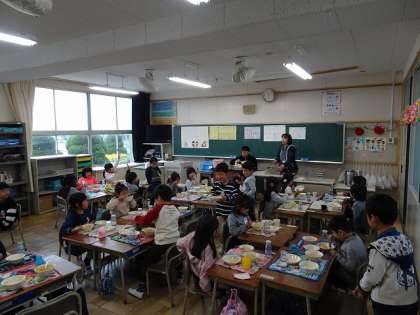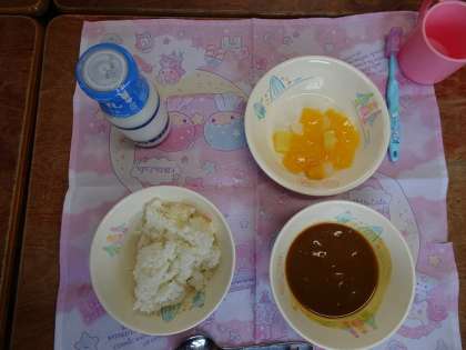 初めての給食は、カレー、ごはん、ミカンゼリーあえ、牛乳でした。