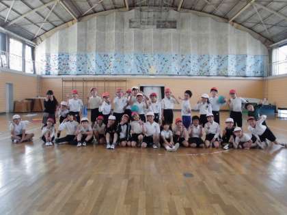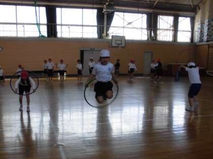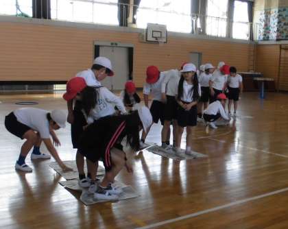 体育で、「体ほぐし運動」を行いました。新聞リレーやボール、フラフープを使ってリレーをしました。グループで声をかけ合いながら楽しく運動することができました。