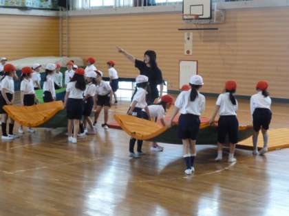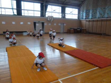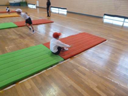 マットを使って、前回り、後ろ回りを行いました。マットの準備もみんなで行っていました。1年生で習ったことを思い出しながら、上手に回ることができました。