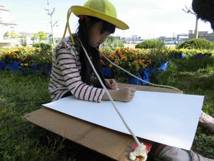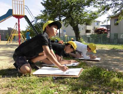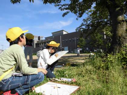 写生大会に向けて下絵を描き始めました。4年生のテーマは、「季節を感じる風景」です。それぞれお気に入りの場所で、思い思いに描き始めました。木や花を真剣に見つめる姿が印象的でした。