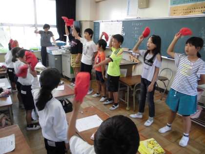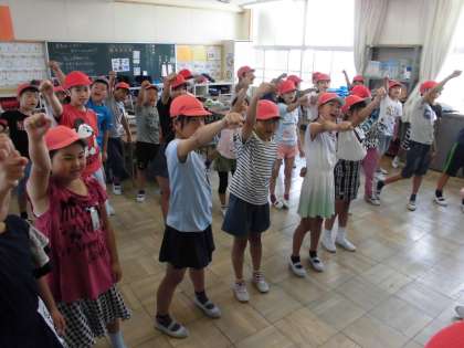 運動会の応援練習が行われています。4〜6年生の応援団の人が各クラスを回って、応援歌や3・3・7拍子の練習をしています。どのクラスからも大きな声が聞こえてきて、運動会への意気込みが感じられます。運動会まであと1週間、みんなで心に残る運動会をつくり上げていきましょう。