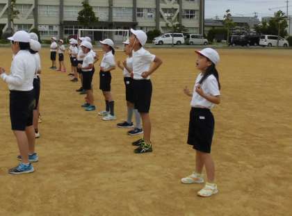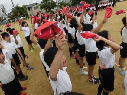 運動会の応援練習を全校で行いました。応援団を中心に赤白、応援歌や応援合戦を行いました。大きな声で運動会w盛り上げようとがんばっています。