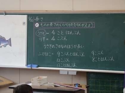「ものの長さのくらべかたをかんがえよう」というめあてで、授業が行われていました。