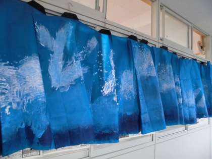 運動会のソーラン節で着る半被に、波の絵を描きました。ソーラン節に合う激しい波をイメージしました。運動会での演技を楽しみにしていてください。