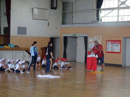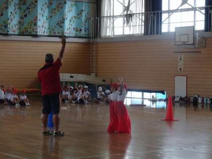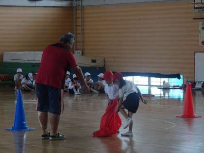 屋内運動場で、競争遊戯について説明を聞いていました。