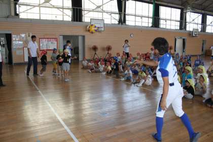 一年生はお礼に、運動会に向けて練習したダンス「笑—笑」を披露しました。また、選手が投げたビーチバレーボールをキャッチできるか、チャレンジし、会場が盛り上がりました。