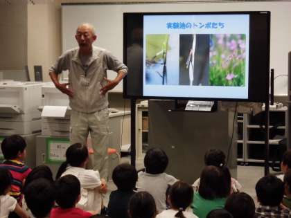 今日は、トンボと水辺環境研究所 理事の川口さんを講師にお招きして、トンボについての学習とヤゴの救出を行いました。