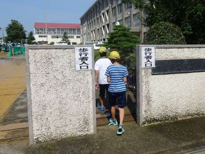 5年生保護者の皆様で、明日、明後日に自転車でご来校の方は、この「歩行者入口」から校内に入っていただき、自転車を停めてください。