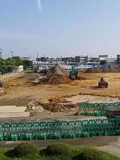 運動場の工事が本格的に行われています。暑さの厳しい中、工事の方々は大規模な作業を行っています。