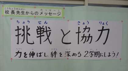 最後に2学期スタートにあたり、みなさんへのエールは、「挑戦と協力を心がけ、力を伸ばし、絆を深める2学期にしよう!」です。2学期は、たくさんの行事があり、一番長い学期です。一人一人の力がぐんぐん伸びる学期です。力を伸ばすためには、小さなことでもいいので、挑戦してください。失敗しても大丈夫です。経験になり成長につながります。挑戦する気持ちを大切にしてください。また、学校ではみんなで生活し学んでいます。協力したり、助け合ったりする気持ちを大切にしてください。キーワード「挑戦と協力」を心がけ、一人一人が大いに力を伸ばし、絆を深める2学期になることを期待します。』
