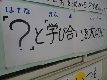 2問問題を出しましたが、授業でも同じように、「?」(はてな)と疑問を持つことが大切です。どの授業でも「?」(はてな)と疑問を持って、自分から進んで取り組んでいくとよいと思います。先生の話をよく聴いて、考えたり、友達と意見を出し合って考えたり、教え合ったりして、「?」(はてな)を解決してください。その解決に向けて努力していくことが勉強になります。先週、ある学級で、友達同士で教え合ったり学び合ったりする姿が見られました。みんなで前向きに学習する雰囲気が感じられました。とてもいいなあと思いました。わからないことは、早めに先生や友達に聞いてください。恥ずかしがっていて勉強はできません。また、聞かれた人は、必ず教えてあげてください。「教えることは二度学ぶ。」と言われます。教える人は、わかるように教えるため、じっくり再び学ぶことになり、本人にとっても深く学ぶ機会になります。みんな、わかるようになったり、できるようになったりすると、うれしいですね。授業では、毎時間、新しいことを学びます。いつも初めからわかったり、できるようになったりすることはありません。こつこつとがんばってほしいと思います。自分から進んで取り組み、友達と学び合って、確かな学力を身につけていってほしいと願っています。『「?」(はてな)と「学び合い」を大切に』がんばってください。』