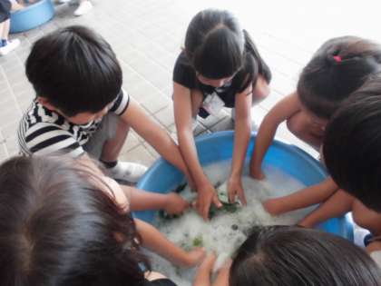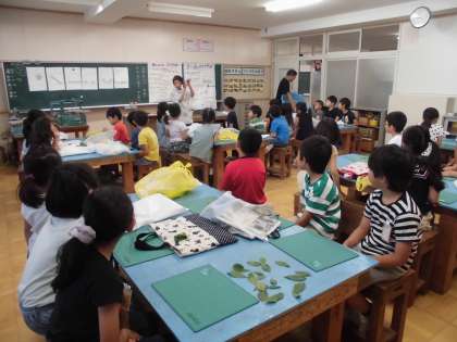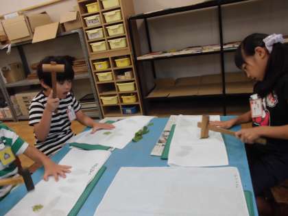 1年生は藍染めを体験しました。アサガオのたたき染めのことを思い出して、力の加減も上手にできたようです。葉の並べ方も工夫ができ、みんなと楽しく活動しました。
