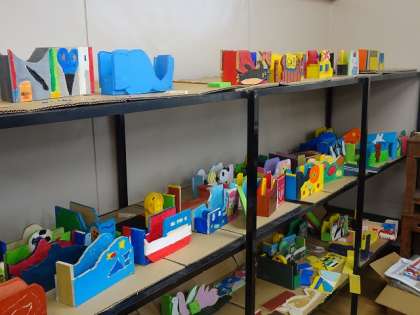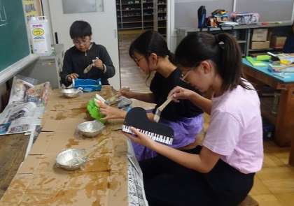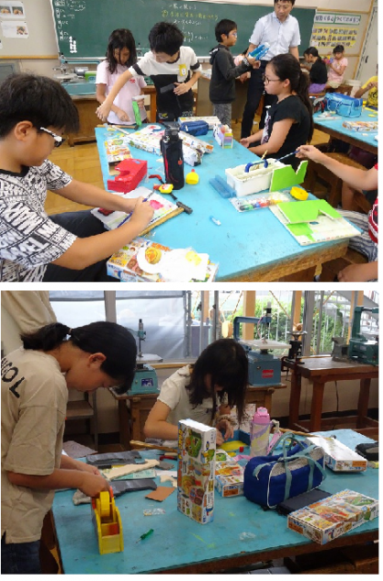 テープカッターに思いもいのデザインを描き、組み立て、色を塗り、その上からニスを塗っていました。