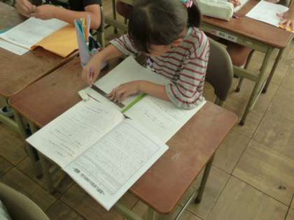 先日のスーパーマーケット見学で、見てきたことや聞いてきたことなどを、しおりのメモや写真を見ながらみんなで学びました。お店の工夫なども考えました。