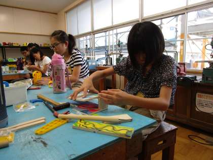 テープカッター作りが最終段階に入ってきました。多くの児童が組み立て作業を行い、仕上げのニス塗りをしました。いよいよ来週は完成です。作品の鑑賞会を行い、友達の作品の良さを感じさせたいと思います。