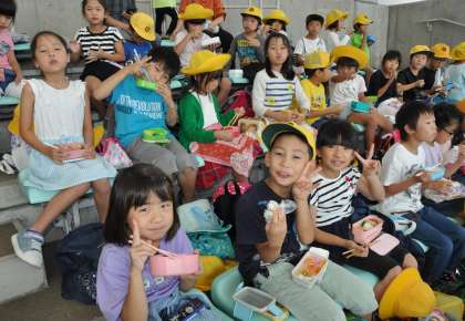 1・2年生は、秋の校外学習で名古屋港水族館を訪れました。楽しみにしていたお弁当を食べた後、イルカショーを見ました。イルカがジャンプするたび、子どもたちの歓声が響きました。