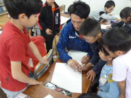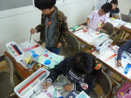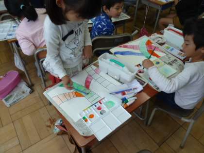 1年生の図工では、初めて絵の具の使い方を学びました。水加減に気を付けながら、色の濃淡を表現しました。はみ出さずに上手に描くことができました。