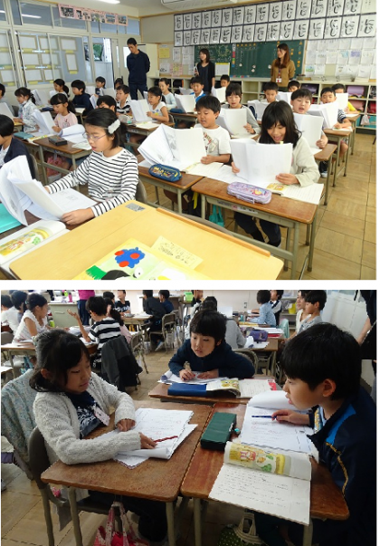 「おじいさんの様子や気持ちの変化を考え、おもしろいところを見つけよう」というめあてで、授業が進められていました。
