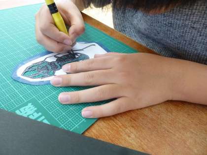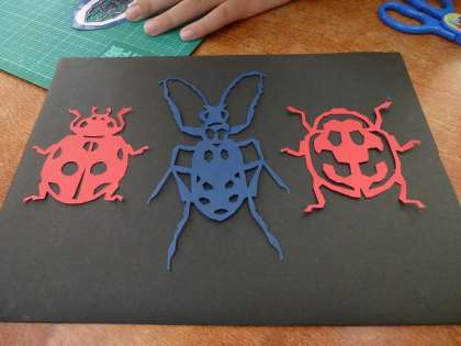 図工の時間に、切り絵をしました。子どもたちの興味のある動物や昆虫、草花の図案から、好きなものを選びました。カッターを使うコツや力加減もわかるようになり、作品はどんどん美しいものになってきています。楽しいこと、得意なことがまたひとつ増えました。