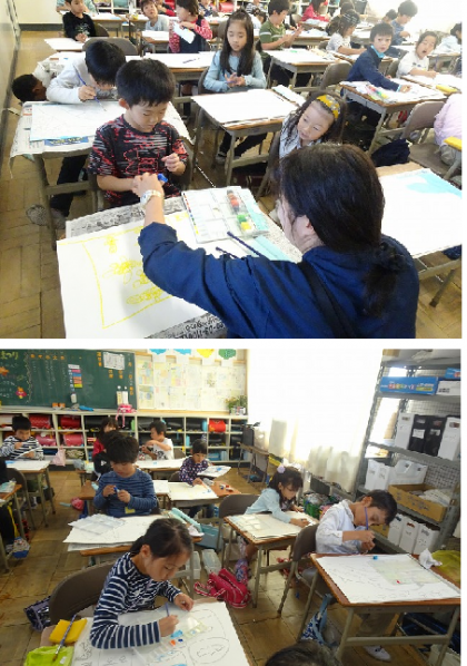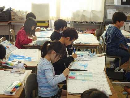 名古屋港水族館にみんなで出かけた「秋の校外学習の思い出」を描いていました。