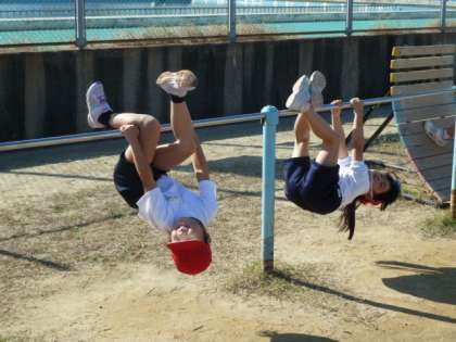 青空のもと、てつぼう運動を行いました。いろいろな技に挑戦したり、友達と遊びを取り入れながらとても楽しそうに運動していました。