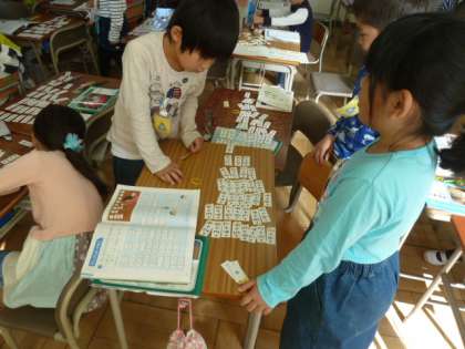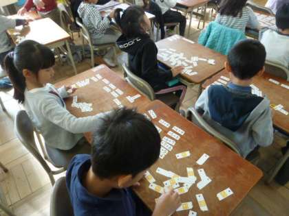 算数では、たし算カードをならべて、どのようなきまりがあるのか考えていました。友達と相談しながら、頑張って考えていました。きまりを見つけてどんどん並べる子もいました。