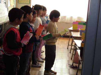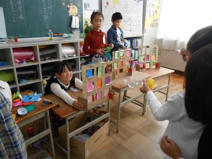 2年生は、「おもちゃまつり」を行いました。自分たちで作ったおもちゃについての発表をした後、おもちゃのお店をひらいてお客さんをおもてなししました。