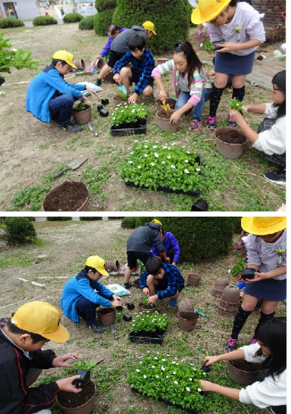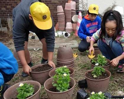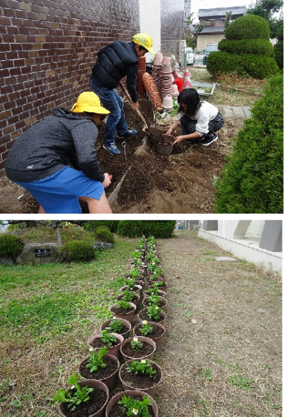 中間放課を使って、園芸委員会のみなさんが、きれいな花の苗を鉢に植えていました。