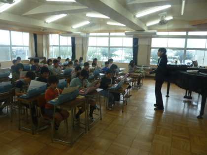 音楽の時間、先生のリズムに合わせて鍵盤ハーモニカを演奏していました。指使いとリズムに気を付けながら、上手に奏でていました。