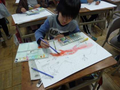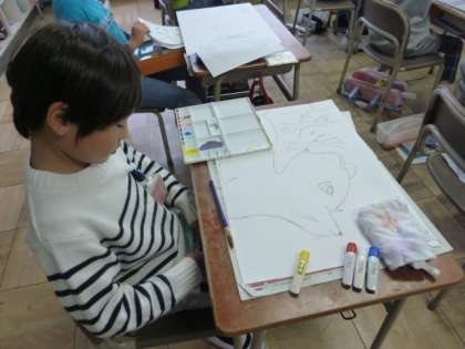 図工では、きつねを題材にした絵を描いていました。情景がわかるように、きつねの動きや表情、まわりの様子などを丁寧に下書きしていました。