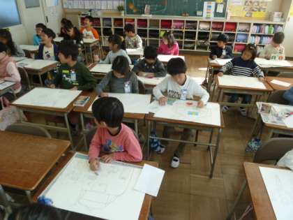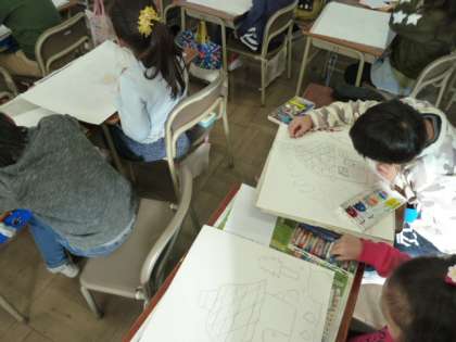 「ヘンゼルとグレーテル」のお話を聞いて、場面を思い浮かべながら絵を描きました。森の様子やお菓子のおうちなどを丁寧に描いていました。