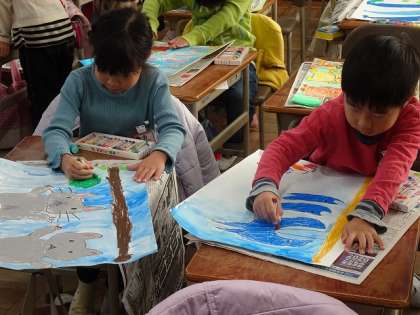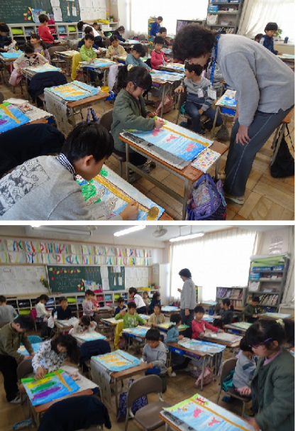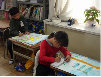 1年生の図画工作の授業では、「○○のぼりを描こう」というテーマで、思い思いののぼりを描いています。いよいよ完成です。一生懸命に最後の仕上げに取り組んでいました。