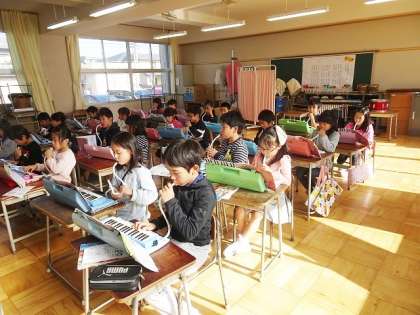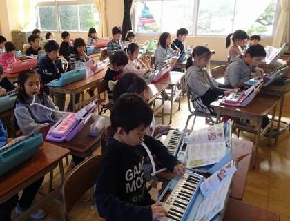 先生のオルガンに合わせて、みんなでけん盤ハーモニカを演奏していました。